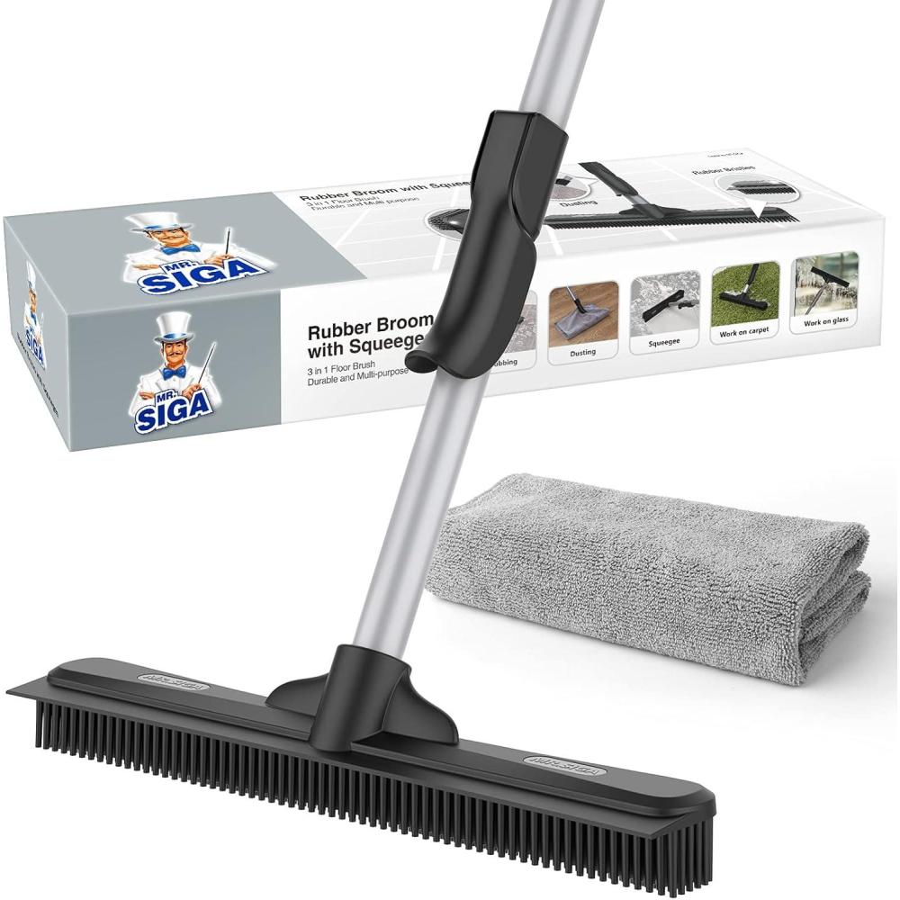 MR.SIGA Pet Hair Removal Rubber Broom with Built in Squeegee, 3 in 1 Floor Brush for Carpet, 61 inch Adjustable Handle, Includes 1 Microfiber Cloth for Floor Dusting